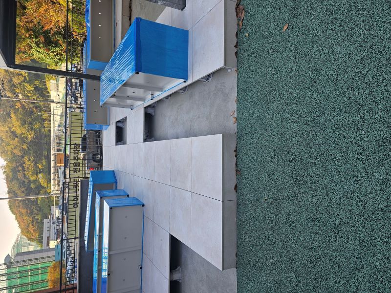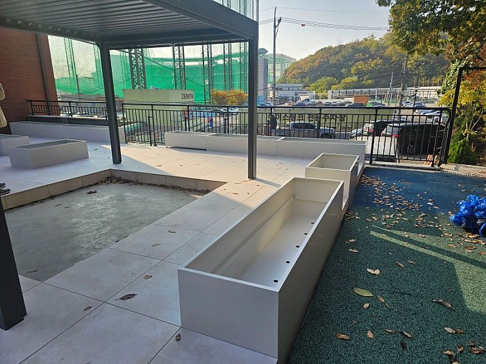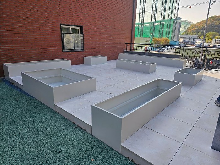 구로현장은 플랜트박스 자리를 제외한 곳에 페데스탈 타일시공하여 철제플랜트박스를 설치하였습니다.