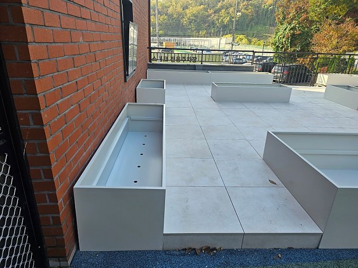 이렇게 제작시 플랜트박스의 토심은 깊어 큰나무 식재도 가능하면서 페데스탈 타일과의 단차로 인해 낮은 화단을 조성하게 됩니다.